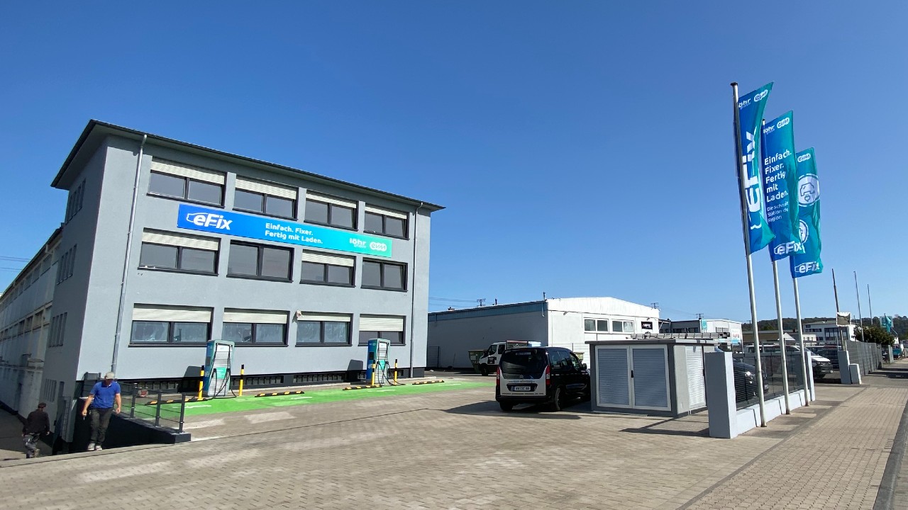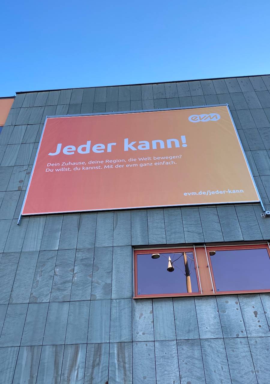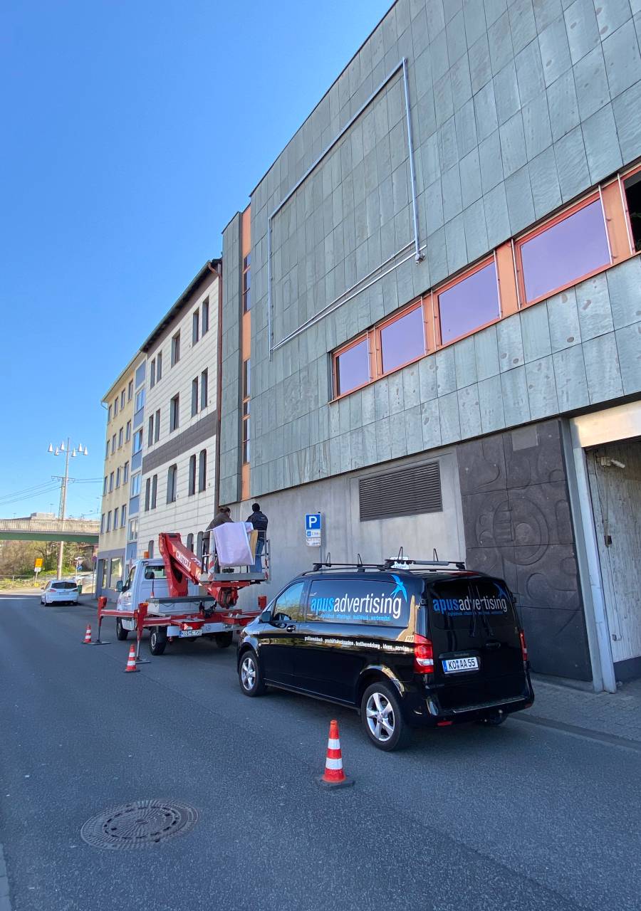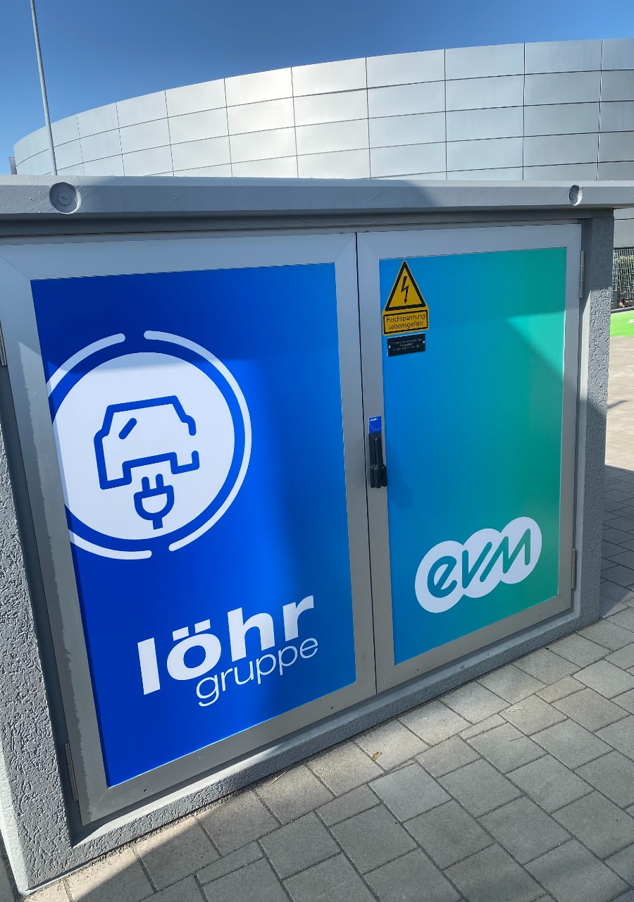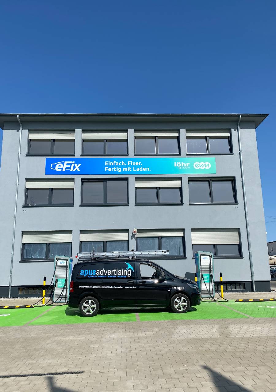 Fassadenschild, Fahnen, Verklebung Trafostation + Ladestation